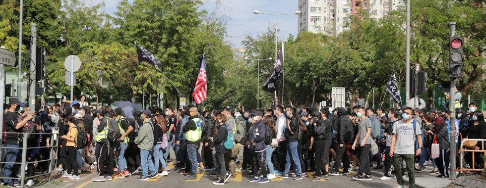 有遊行人士高舉不同旗幟,包括「光復香港,時代革命」、「香港獨立」、美國旗、英國旗、香港旗等旗幟。