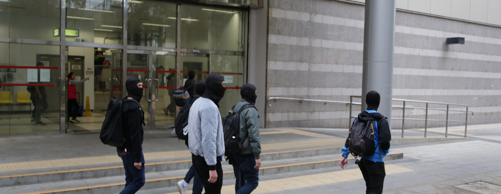 本媒記者發現,該四名疑似爲便衣警員的人士蒙面人士,背着示威者經常用開的迪卡農黑色背囊(D記背囊)。